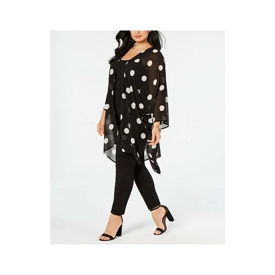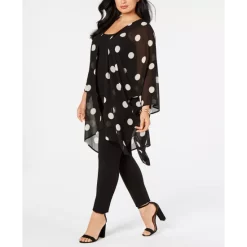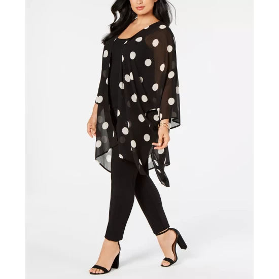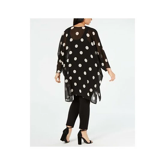 One wispy layer can add splashy style to any outfit with Anne Klein’s plus size big dot chiffon jacket.