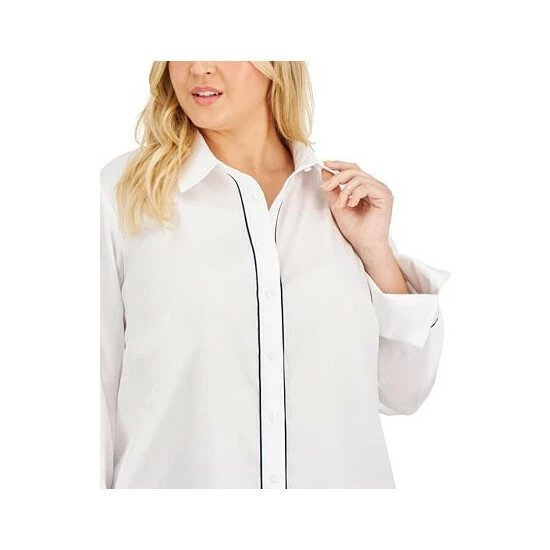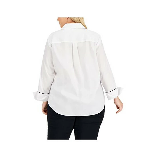 Piped trim highlights the front packet and cuffs on this plus size cotton blouse from Anne Klein.