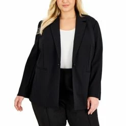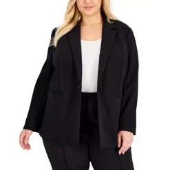 Anne Klein’s sleek plus size compression blazer features a classic notched collar and single button closure to cinch the waistline.