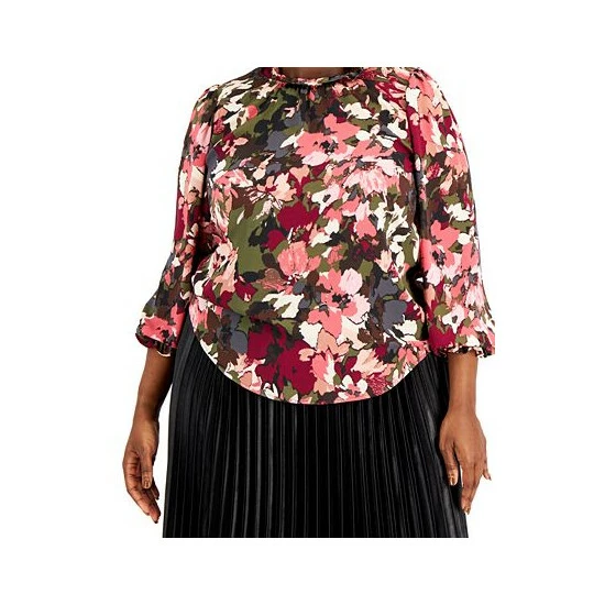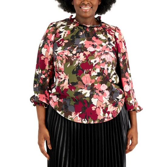 Delicate ruffled trim pairs with a vibrant print for instant polish and style with this plus size blouse from Anne Klein.