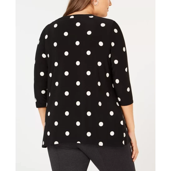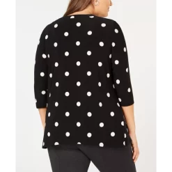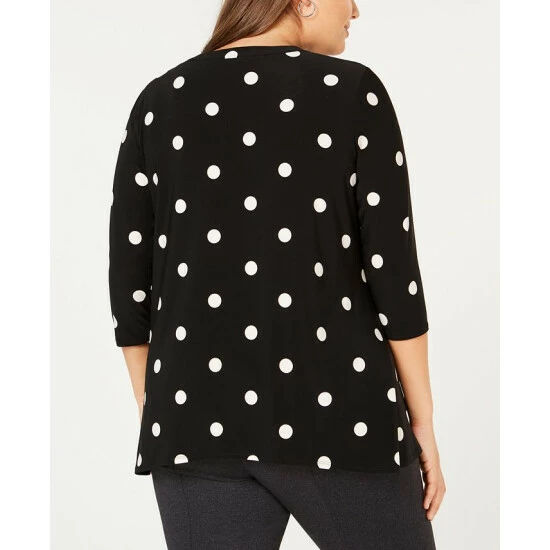 The draping sharkbite hem falls longer at the sides for stylish coverage on this plus size wrap top from Anne Klein, in a charming polka-dot print with 3/4-sleeves.