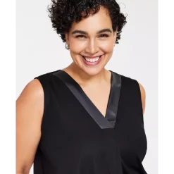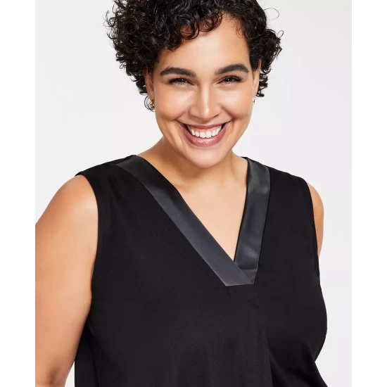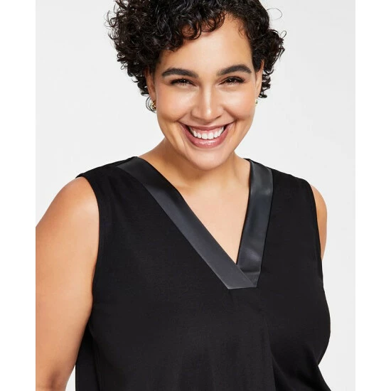 Anne Klein’s plus size V-neck sleeveless top looks sleek with faux-leather trim.