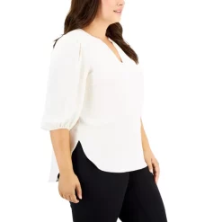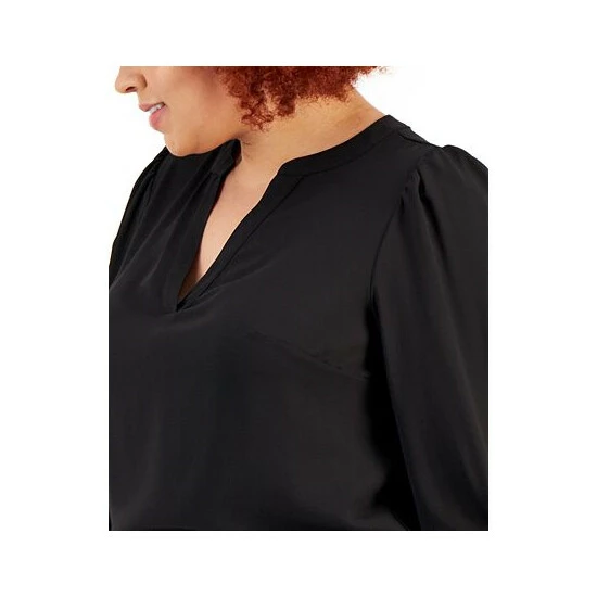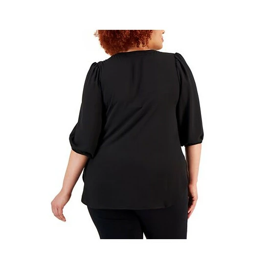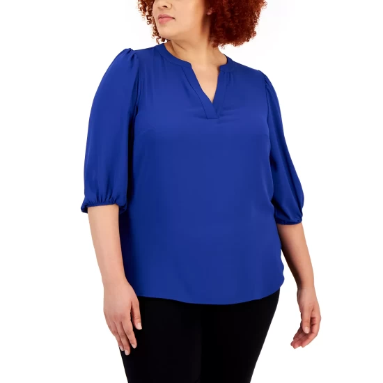 Romantic puff sleeves frame this plus size top from Anne Klein, finished with a charming split neckline.