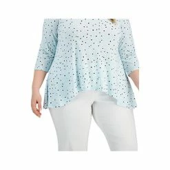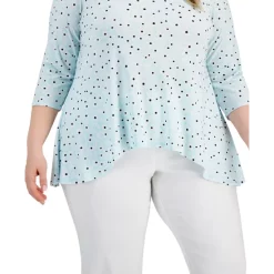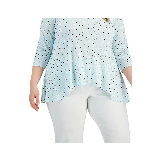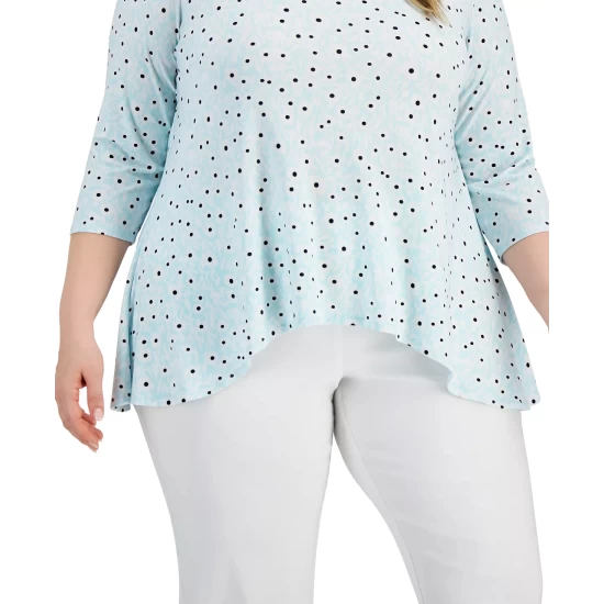 A stylish high-low hemline delivers added coverage at the hips in Anne Klein’s flattering plus size trapeze top in a fun dotted floral knit.