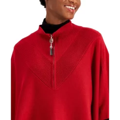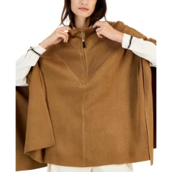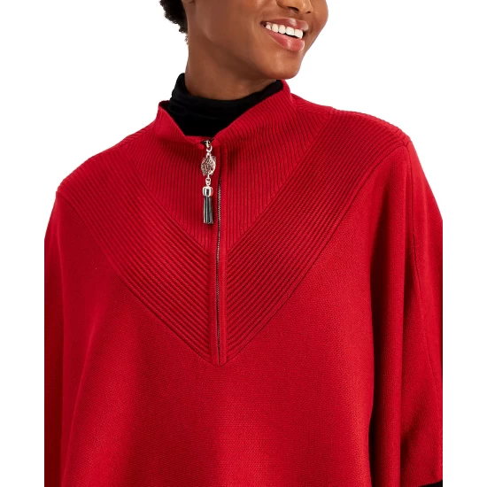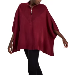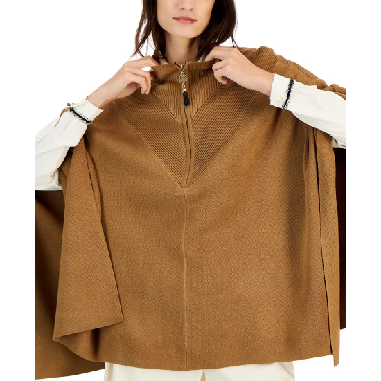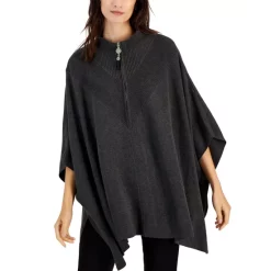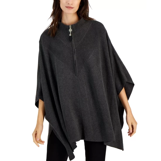 The toss-on ease of Anne Klein’s flowy knit poncho features chevron-shaped ribbed trim at the zip front and back for an all-around smart look.