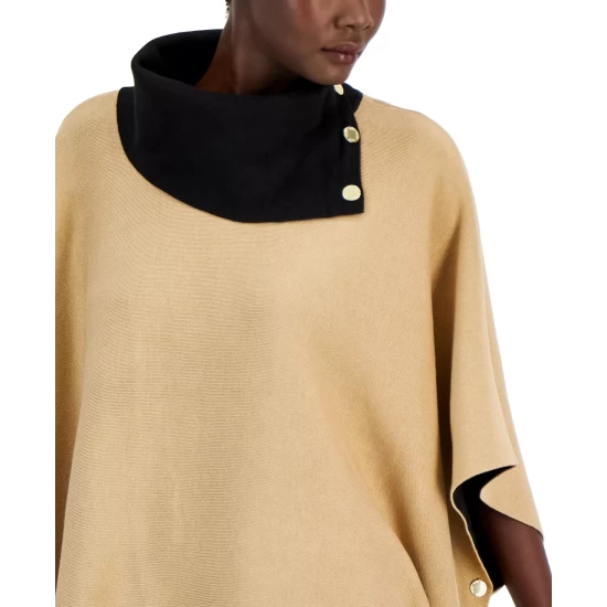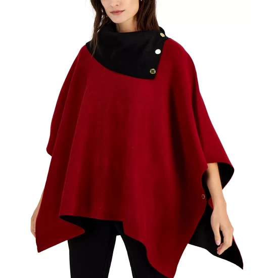 Cozy inside and out in coordinating hues, Anne Klein’s double-face knit poncho is topped with a button-trimmed split collar.