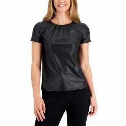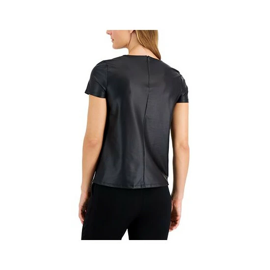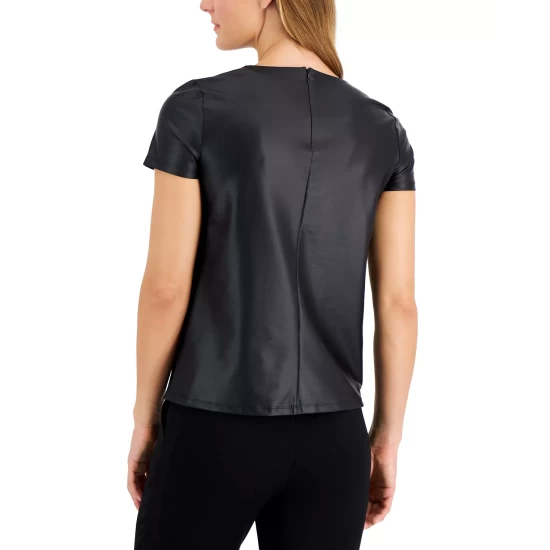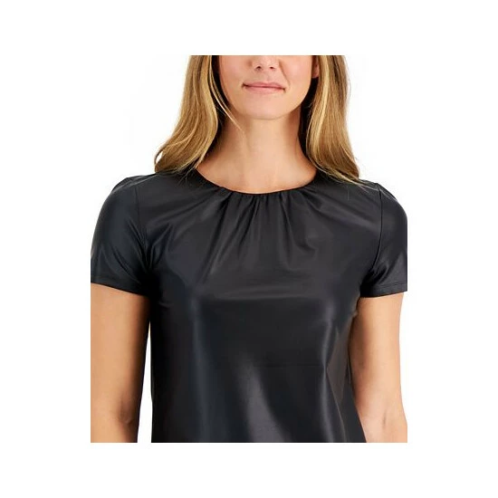 Instantly make any look cooler with this short-sleeve top from Anne Klein, an edgy faux-leather design finished with a gathered front neckline.