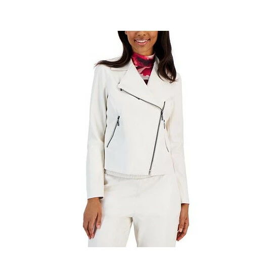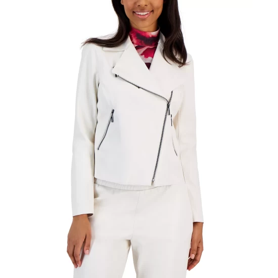 Swap out your basic blazer for something sassier. This Anne Klein moto jacket makes a bold statement with its hardware details and luxe faux-leather design.