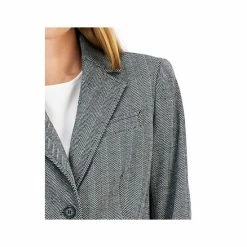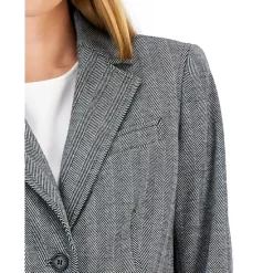 - Jacket: notched collar, button closures at front, side flap pockets, lined