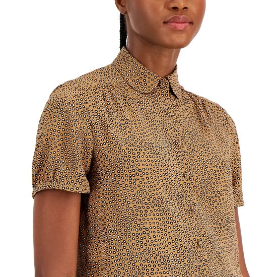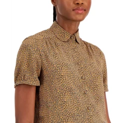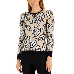 Bold leaf-patterned jacquard knit and pleated-shoulder sleeves add fresh flair to this crewneck sweater from Anne Klein.