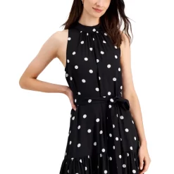 Polished polka dots and a sophisticated halter neckline pair perfectly with the breezy maxi silhouette of Anne Klein’s sleeveless dress.