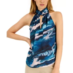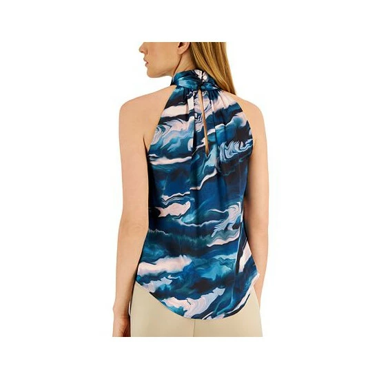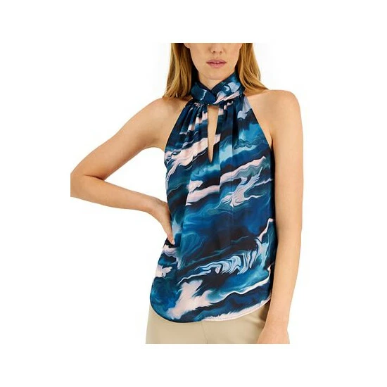 An ocean-wave print lends a statement look this this halter top by Anne Klein, polished to perfection with a twist-neck design.