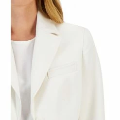 - Jacket: notched collar, button closures at front, side flap pockets, lined